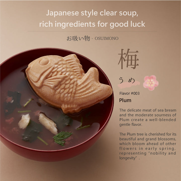 Traditional Japanese soup encased in a festive 'sea bream' shaped monaka. A thoughtful gift that is rich in flavor and filling the heart, suitable for a celebration meal.